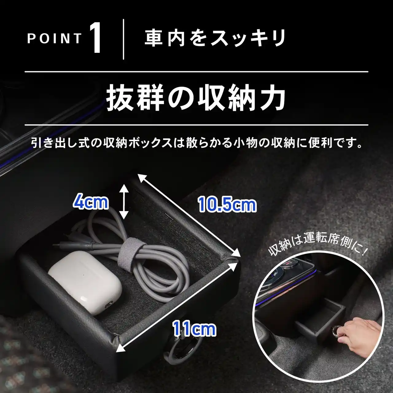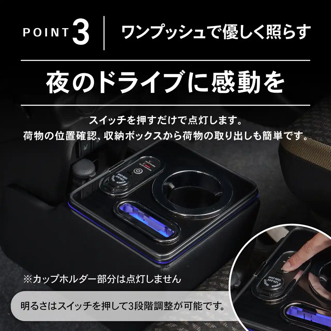 | ハスラー MR52S MR92S専用 LEDコンソールボックス。タイプA、タイプCシガーソケットを完備。夜も安心のLED搭載。引き出し式収納BOXは散らかりを一瞬で解決。設置はフロアの中央に置くだけ。 |