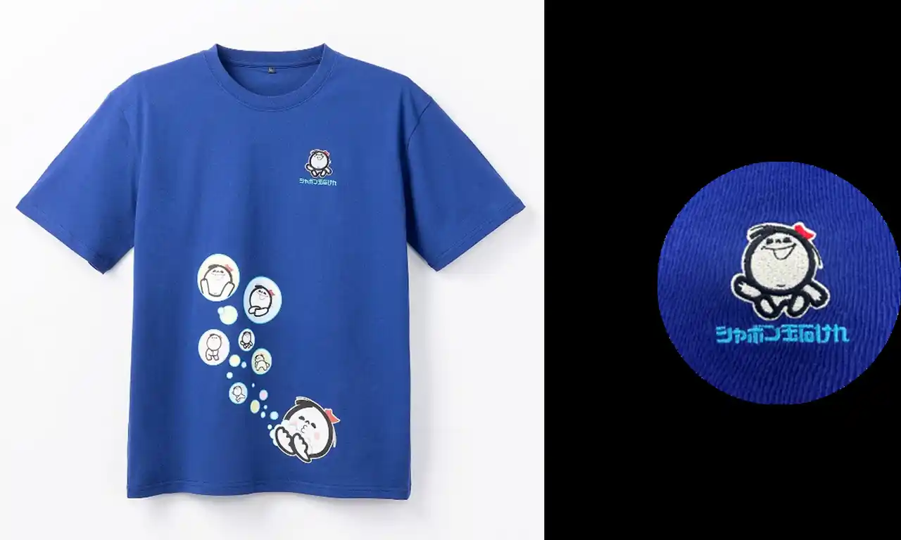 今回のT シャツはシャボン玉石けんのイメージカラーであるブルーを基調とし、表にはイメージキャラクターであるシャボンちゃんの刺繍・プリントがあしらわれています。地元である九州への感謝の気持ちと手に取る人を笑顔にしたいという想いを込めて、シャボンちゃんの色々な表情・ポーズが楽しめるデザインに仕上がっています。 |