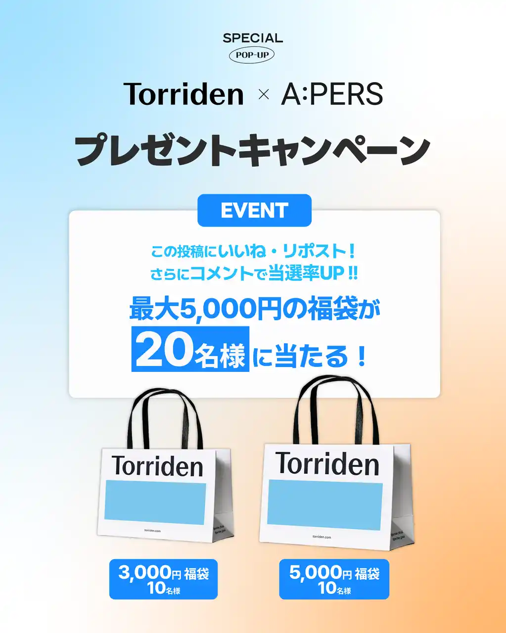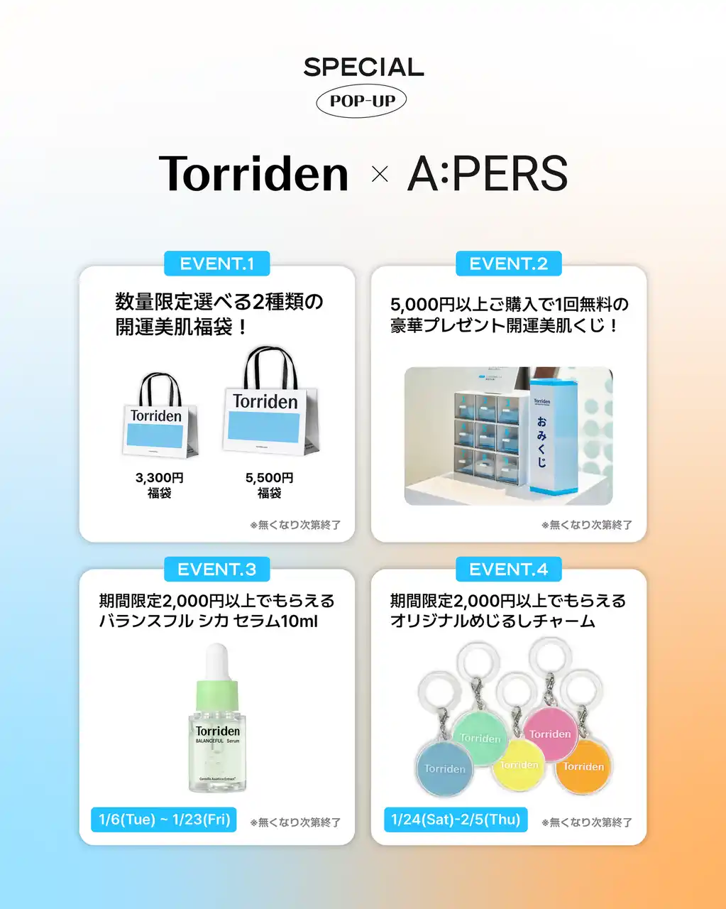 韓国発のスキンケアブランド「Torriden(トリデン)」は、体験型ライフスタイルセレクトショップ「A:PERS(エイパース)」にて、新年限定POP UPイベント「トリデン開運肌参り」を2026年1月6日(火)~2月5日(木)の期間で開催いたします。 |
