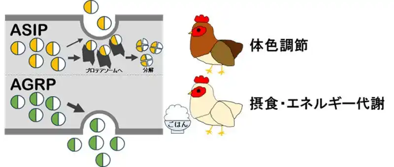 | さらに、この構造がプロテアソームを介したタンパク質分解を誘導し、分泌を制限していることも明らかにしました。本成果は、同じ起源をもつ二つの“兄弟分子”が、「体色制御」と「摂食調節」という異なる機能(「職」)を担うようになった背景に、細胞内輸送を決定づける構造の違いが関わっていることを示すものです。ASIPとAGRPの分泌特性の違いは、鳥類が「色」と「食」を巧みに制御するようになった進化の道筋を解き明かす手がかりとなります。 | |||||||||