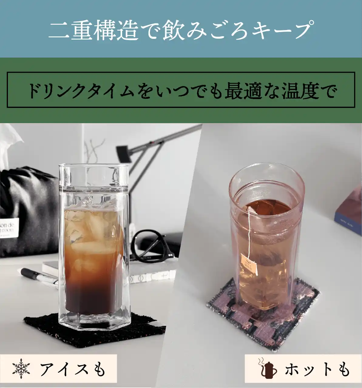 「ボロシリケートガラス」で作られた美しい二重構造で飲み頃温度キープ |