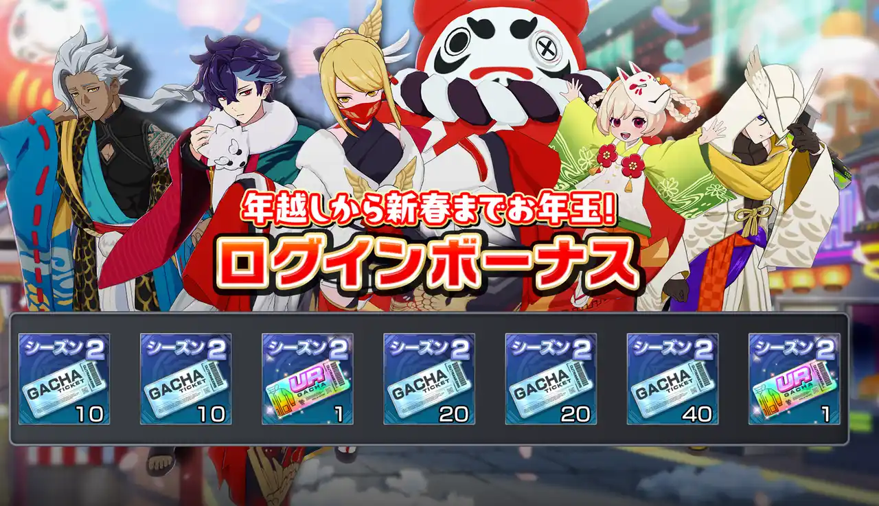 2025年12月29日(月)メンテナンス終了後より、ゲーム内イベント「年末年始ログインボーナス」を実施しております。本イベントにおきましては、実施期間中にログインするだけでガチャチケットを最大で100枚、さらには貴重なUR衣装確定チケットを最大で2枚(いずれもシーズン2用)を獲得可能です。 |
