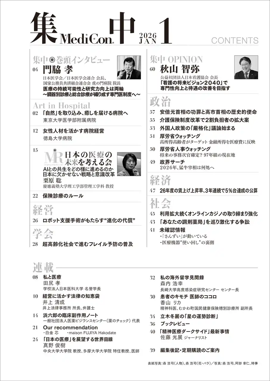 病院経営者・理事長・院長を始め、医師など医療従事者に特化した読者層を誇り、病院の経営戦略や厚生行政、医薬品・医療機器メーカーの動向から国内外の政治や経済、社会・文化の情報まで網羅した総合医療情報誌です。定期購読による直販方式の為、一般の書店ではお求めになれません。 【媒体概要】 媒体名:集中/Medical Confidential 定 価:年ぎめ購読料18,000円(税込1冊1,500円) 判 型:B5判 発売日:毎月末 【定期購読のお申込】 https://www.medical-confidential.com/subscription |