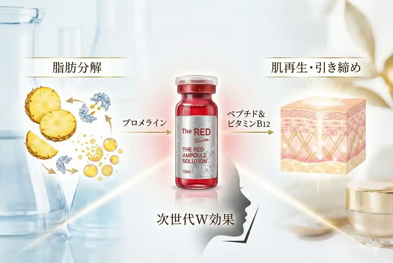 1. 脂肪分解のスピードスター「ブロメライン」 パイナップル由来の天然酵素ブロメラインが、脂肪細胞を柔らかくし、老廃物としての排出を強力に促進。植物由来成分のため、腫れや痛みのリスクを極限まで抑えています。 2. たるませないための「ペプチド&ビタミンB12」 脂肪が減った後の皮膚のたるみを防ぐため、肌の弾力を支える機能性ペプチドと、代謝を促すビタミンB12(製剤の赤色の正体)を配合。 「中身(脂肪)はスッキリ、外側(皮膚)はピンと張る」という理想的な仕上がりを1本で目指します。 |