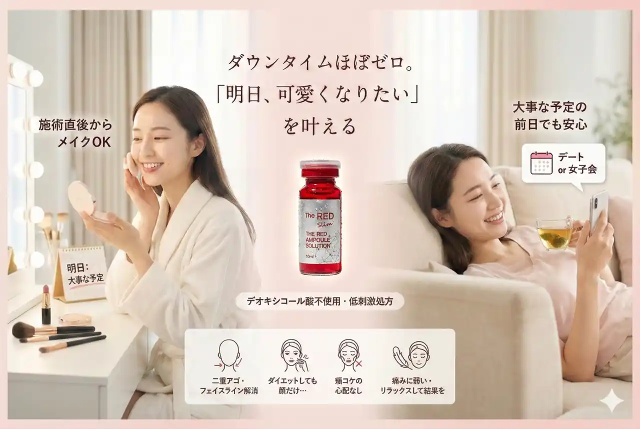 | 忙しい現代女性にとって、施術後のダウンタイム(赤み・腫れ・内出血)は大きなハードルでした。 レッドショットは、クリニックの脂肪溶解注射で一般的によく使われている「腫れや痛みの原因となりやすい成分のデオキシコール酸」を一切使用していません。 植物由来のやさしい処方で作られているため、施術直後からメイクが可能。大事な予定の前日でも、安心して受けていただけます。 | |||||||||