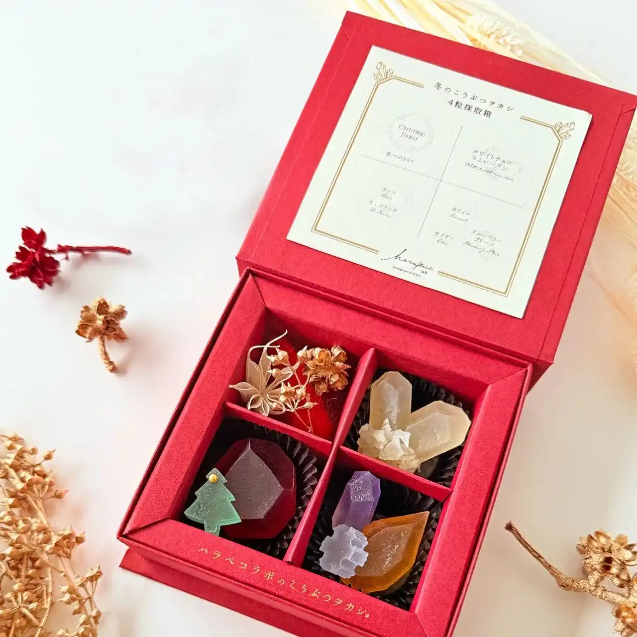 | ハラペコラボは、福岡を拠点に活動する女性中心のクリエイティブブランド。「アートと食の融合」をテーマに、鉱物のように美しい琥珀糖『こうぶつヲカシ』や、色彩と素材にこだわったスイーツ・ケータリングを展開。開発・制作・パッケージデザインまですべてを手作業で行い、“どれひとつとして同じものはない”唯一無二の美しさと想いを届けています。有名ゲーム、有名アニメとのコラボ作品、百貨店催事、雑誌・TVなど多数メディアでも話題に。贈り物として、また自身のライフスタイルを彩るアイテムとして、全国のファンから支持を得ています。 | |||||||||