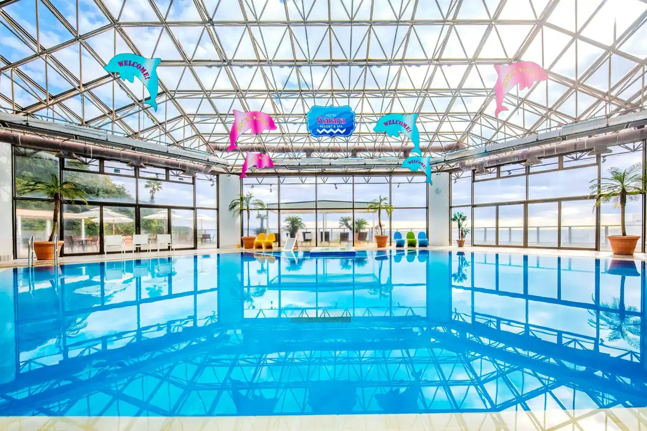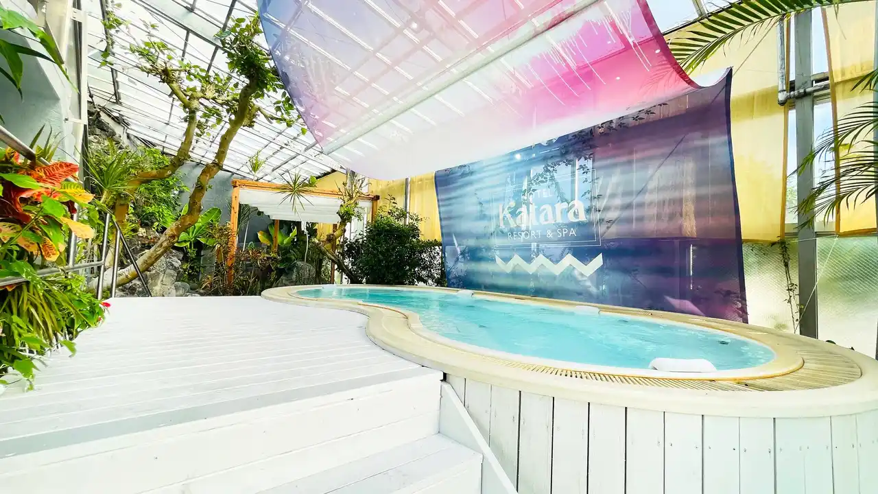 全天候型温泉プールで一年中楽しめる。 |
