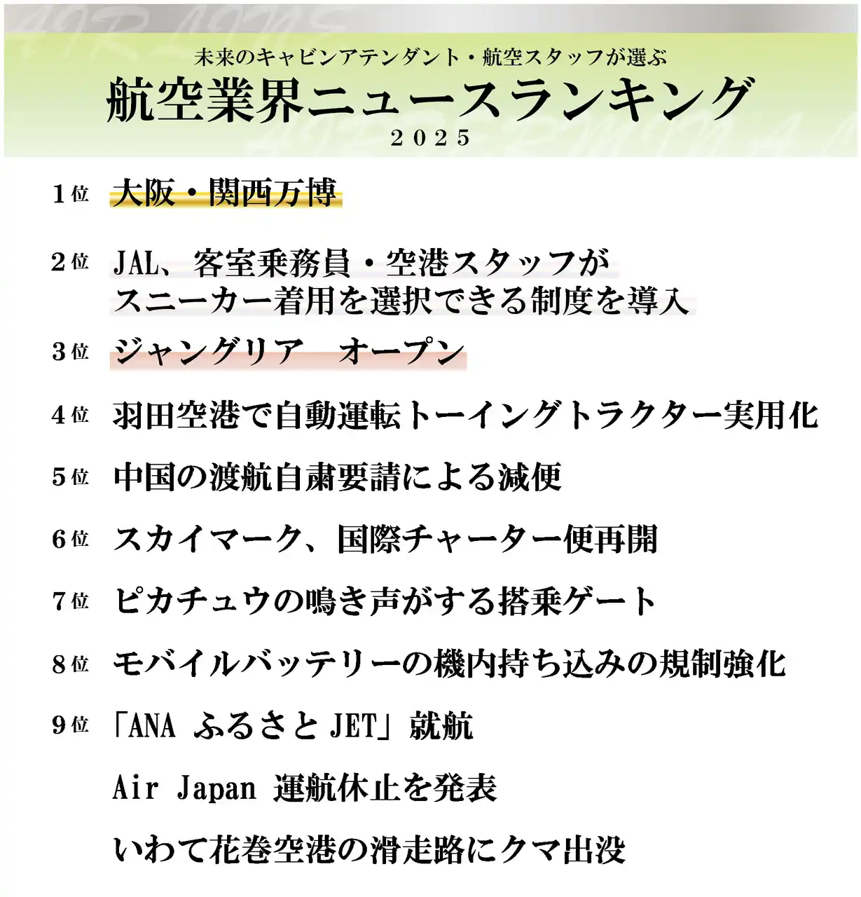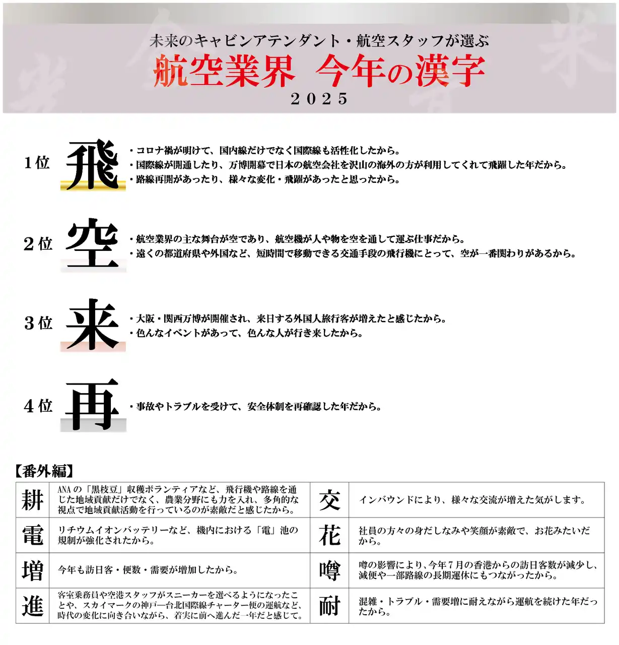 本調査では、キャビンアテンダント、航空スタッフを目指す学生が「本当に印象に残った航空業界のニュース」や、「2025年の航空業界を象徴する漢字」を選出しています。