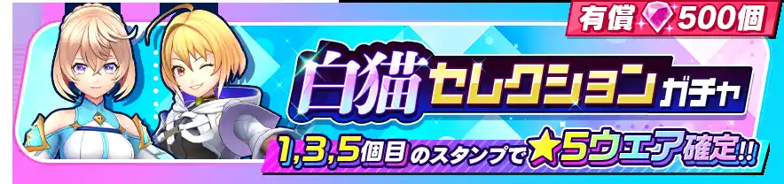 「モンストセレクションガチャ」からはジャック・ザ・リッパー(CV:高橋李依)、ラプラス(CV:鬼頭明里)の2キャラクターのみ、「白猫セレクションガチャ」からエレノア(CV:石見舞菜香)、ウィズ(CV:田村ゆかり)の2キャラクターのみの★5ウェアが登場予定です。本ガチャは有償ジュエル500個限定で5回までまわすことができ、1回目、3回目、5回目のスタンプでは★5ウェアが確定となります。それぞれのキャラクターは限定ウェアも登場します。 |