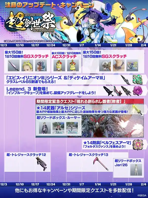 株式会社セガは、好評サービス中の『PSO2 ニュージェネシス ver.2』(以下、NGS ver.2)にて、新たなスペシャルスクラッチ「超・トレジャースクラッチVol.13」の追加をはじめとするアップデートを、2025年12月31日(水)に実施しました。 |
