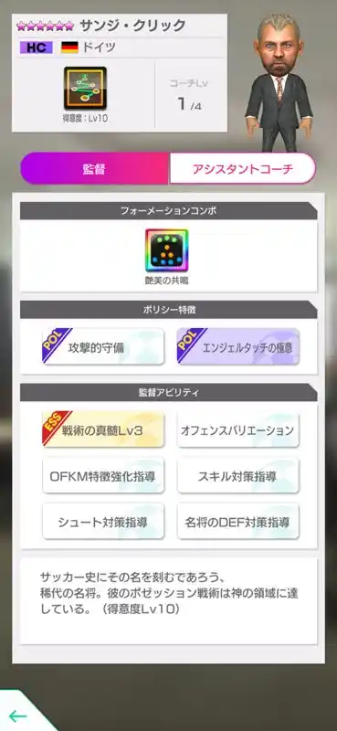 ★6監督「サンジ・クリック」は、マークとパスが大アップし、守備意識が中アップするポリシー特徴「攻撃的守備」を所持しています。 |
