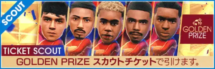 今回のスカウトは「通算ボーナス」つきです。この“GOLDEN PRIZE SCOUT”で通算100人目と300人目の選手を獲得すると、このスカウトにラインナップされている★5選手の中から好きな1人を選んで獲得できる「GOLDEN PRIZE交換チケット」が手に入ります。 |