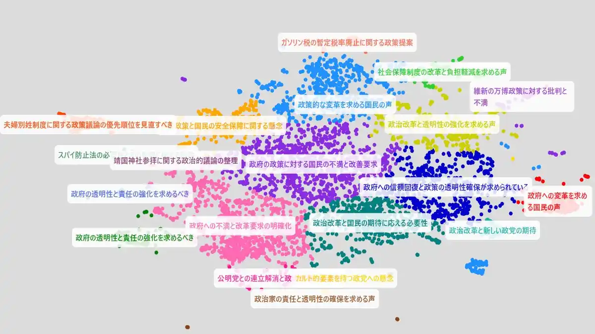 投稿をクラスタリングし、論点の“塊”と相互関係を俯瞰 |