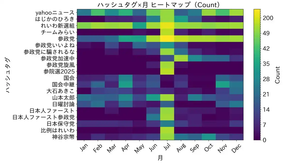 2025年のSNS上で政治系ハッシュタグの増減をヒートマップで可視化した図 |