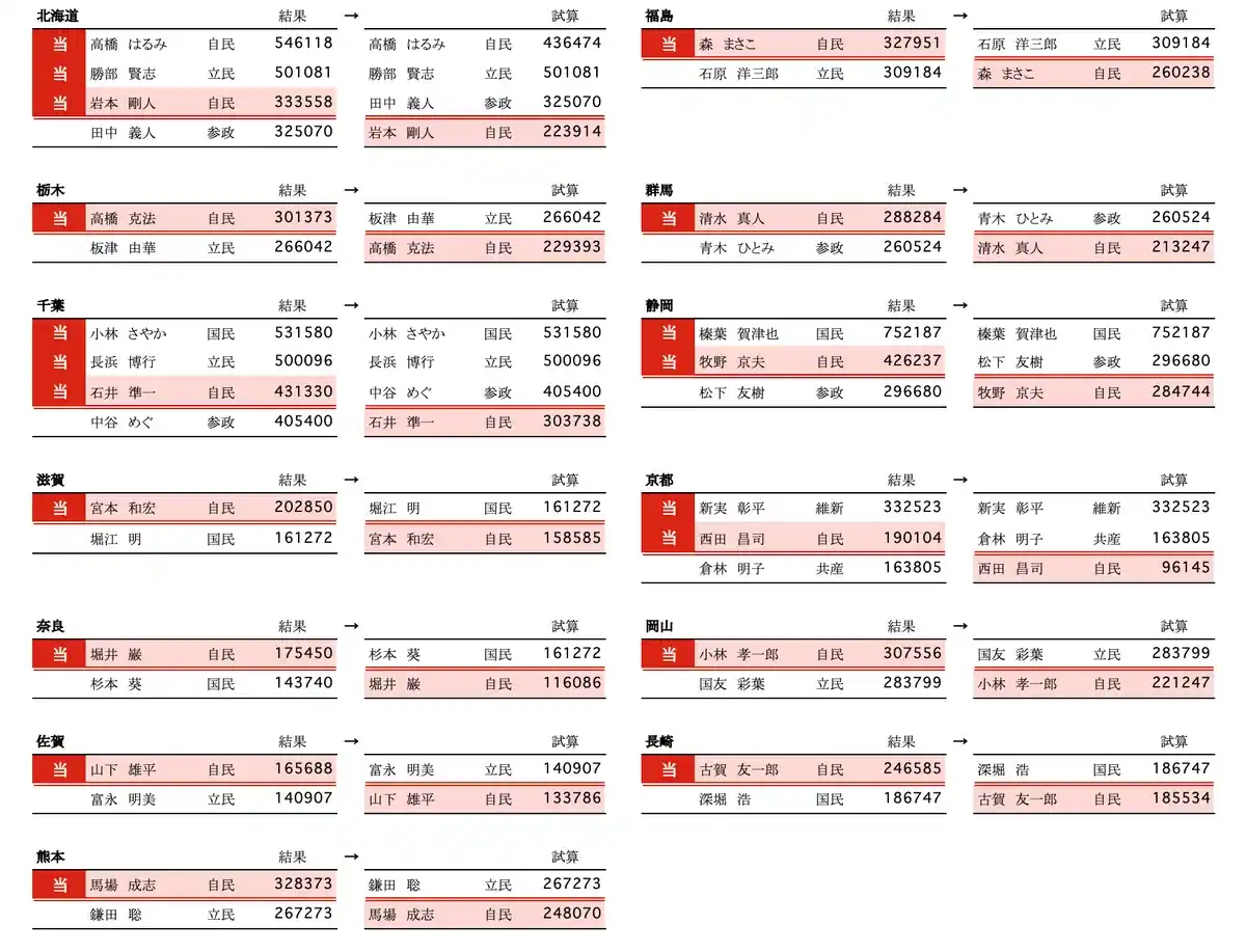 過去の選挙結果に公明党離脱という仮定を置き、当落が入れ替わり得る選挙区を試算 |