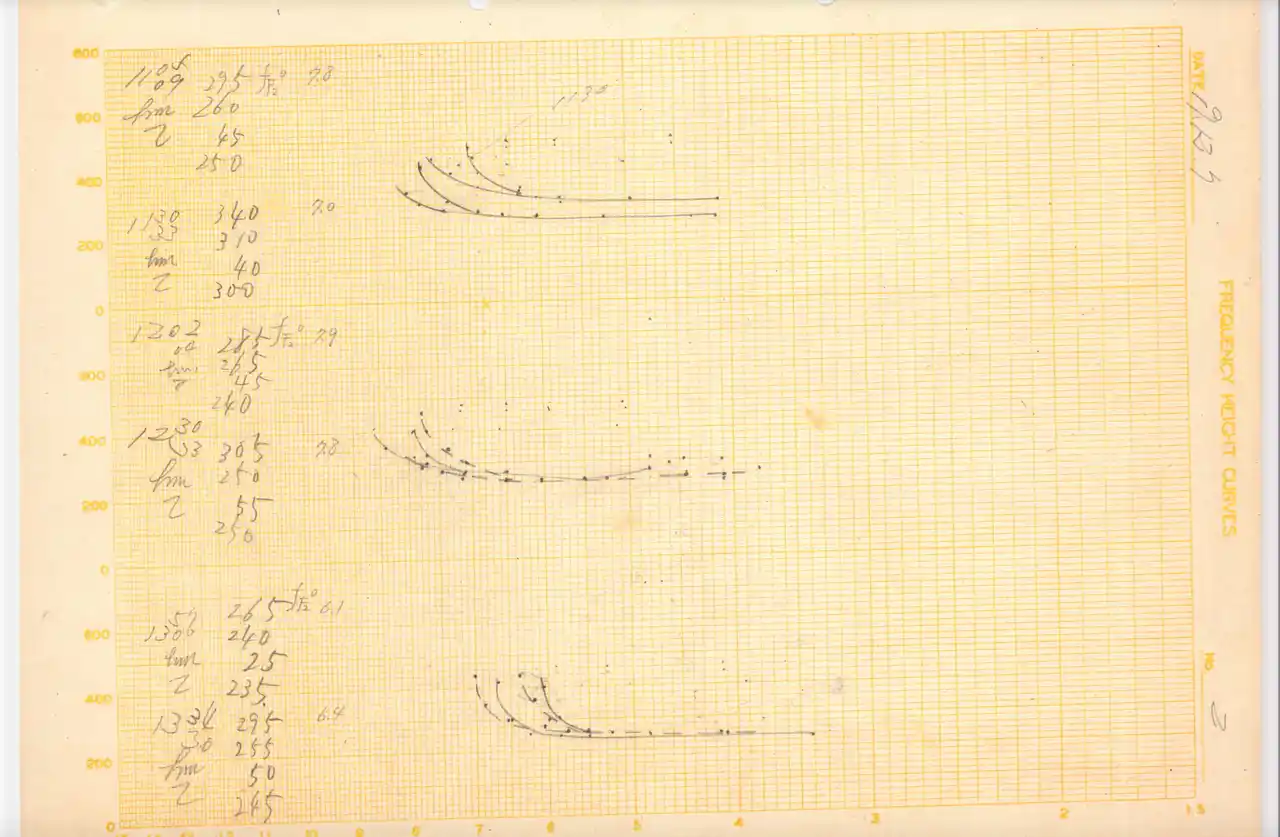 図2: 公開された「当時」の手書きのイオノグラムPart 2。当時、平塚(神奈川県)にあった電離層観測装置(イオノゾンデ)で観測されたイオノグラム。電子数密度は地震発生当日(1944年12月7日)の12時30分(日本時間)に臨界周波数が急増(7.8MHz)し、電子数密度が急増していることが示されています。イオノグラム周波数は海軍方式であり、横軸は右から左へ周波数が増加します。当時、日本は稀に見る数の電離層観測装置による観測網を展開し、世界に先駆ける研究成果を蓄積していましたが、陸軍方式(左→右)と海軍方式(右→左)のイオノグラムが標準化されていませんでした。 |