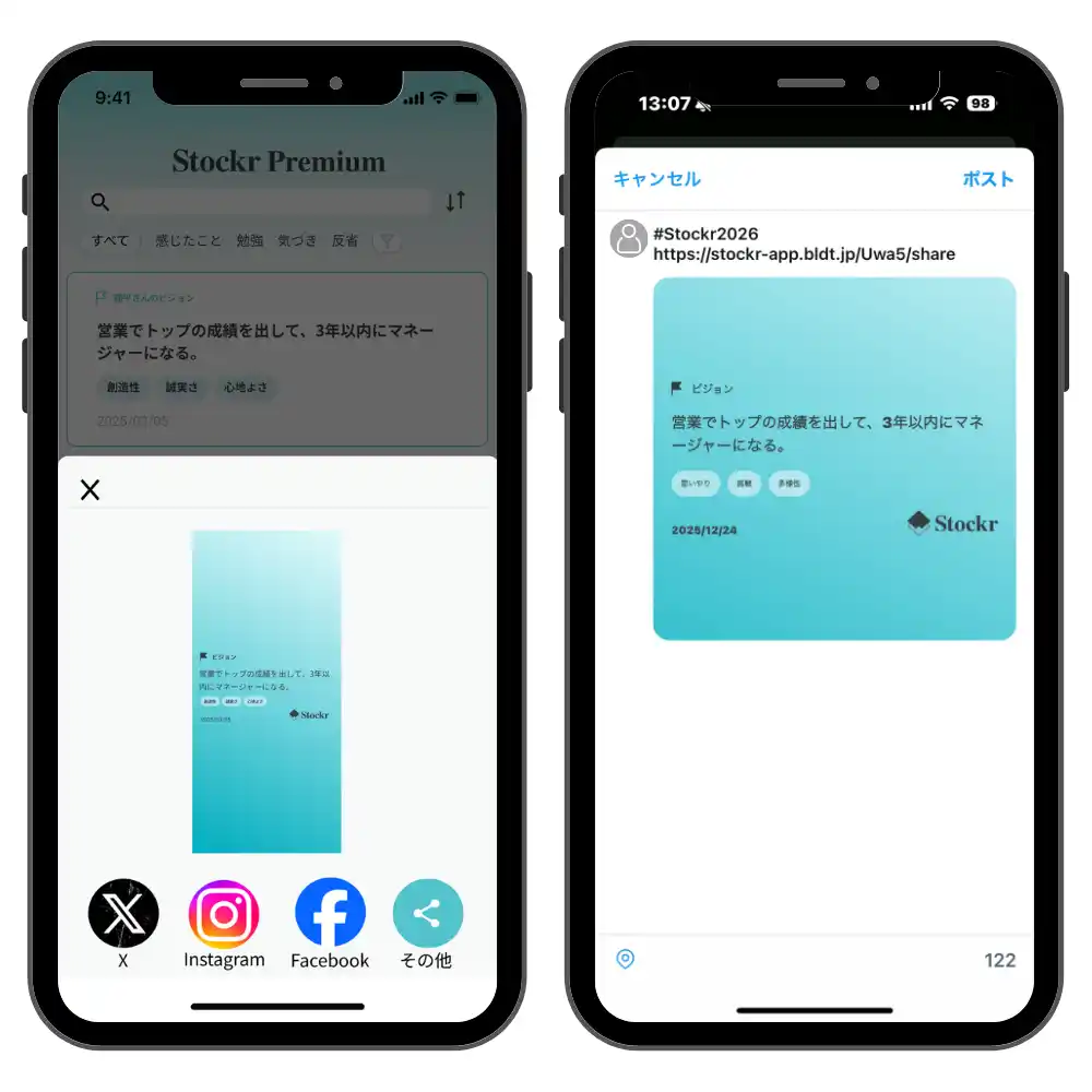 株式会社ビルディット(所在地:東京都八王子市、代表取締役:富田陽介)は、提供する振り返りノートアプリ「Stockr(ストッカー)」において、新年の抱負や目標、理想の自分を外部へ共有できる新機能「ビジョンシェア機能」を2025年12月19日にリリースしました。本機能では、設定したビジョンを家族や友人、SNSなどに共有することで、目標や理想の自分の実現に向かう行動を続けやすくします。 |