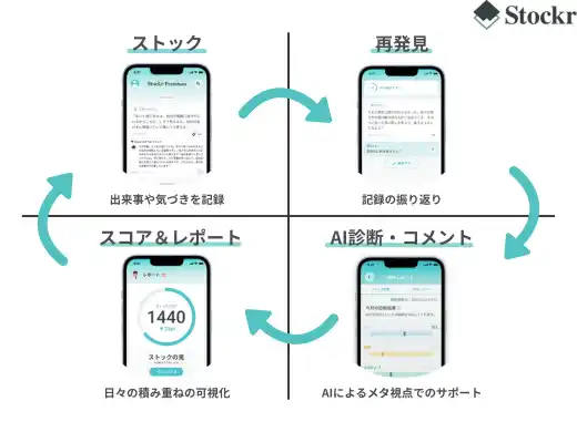 振り返りノートアプリ「Stockr」は、日々の出来事や感じたことを記録し、自分を振り返ることで、自己理解を深め、自信と成長を育むアプリです。日記・タスク管理・メンタルケアといった従来の内省系アプリとは異なり、「書いて終わり」にせず、「行動を記録する→自分の思考や行動を振り返る」というループを通じて、理想の自分(=ビジョン)に近づくプロセスを支えています。 |