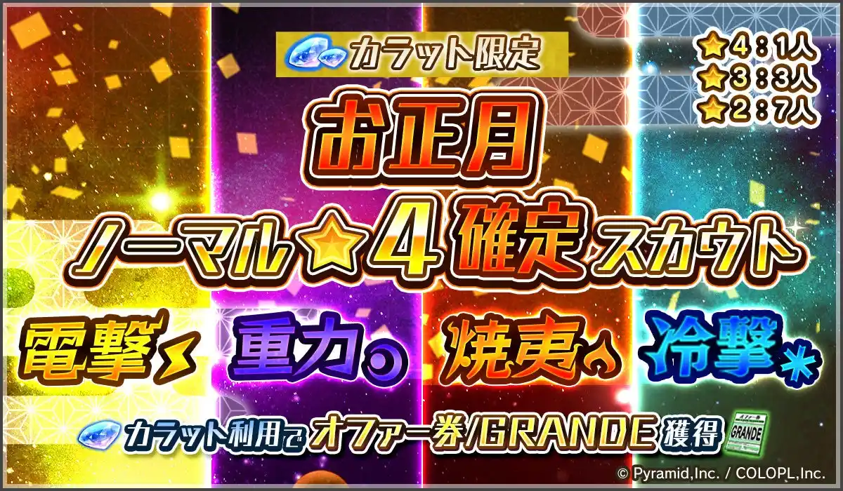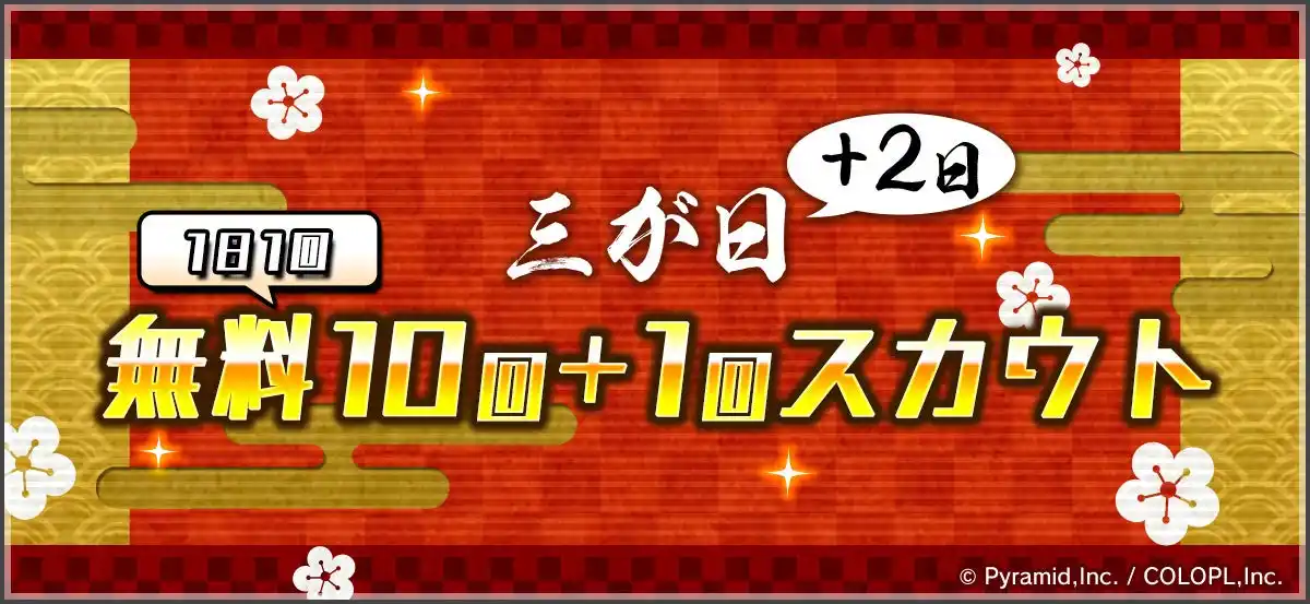 2026年1月1日(木)0:00より、無料スカウトが毎日行える「三が日+二日 無料10回+1回スカウト」や、★4キャラが確定入手できる各種「★4キャラ1人確定スカウト」など、様々な「お正月アップデート」をゲーム内にて開催しております。 |
