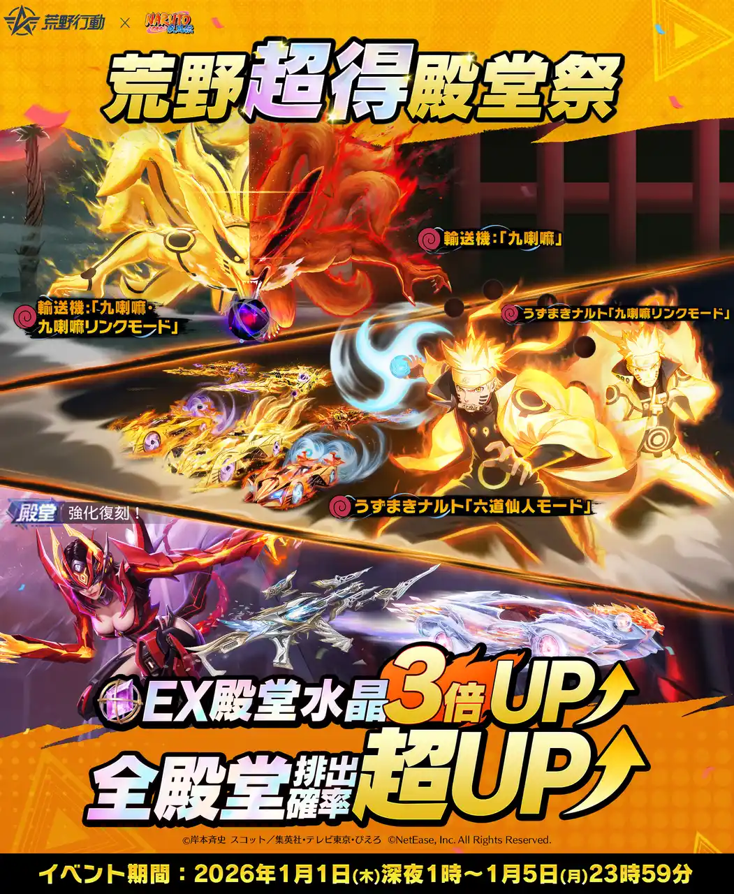| NetEase Gamesが開発・運営する大人気バトルロワイヤルゲーム『荒野行動』では、2026年1月1日から1月15日まで、『NARUTO-ナルト- 疾風伝』と初のコラボイベントが開催されます。ナルト、サスケ、サクラ、カカシなどの人気キャラクターが荒野行動に登場。木ノ葉隠れの里の忍者たちと共に新年を盛り上げます! | |||