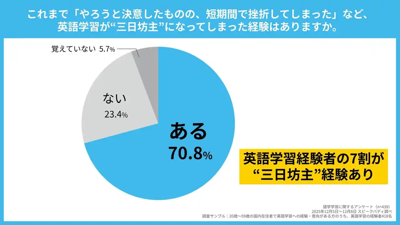 当社が英語学習の経験がある方を対象に2025年12月に実施した調査(n=418)では、7割以上の方が「『やろうと決意したものの、短期間で挫折してしまった』など、英語学習が“三日坊主”になってしまった経験がある」と回答しました。 |
