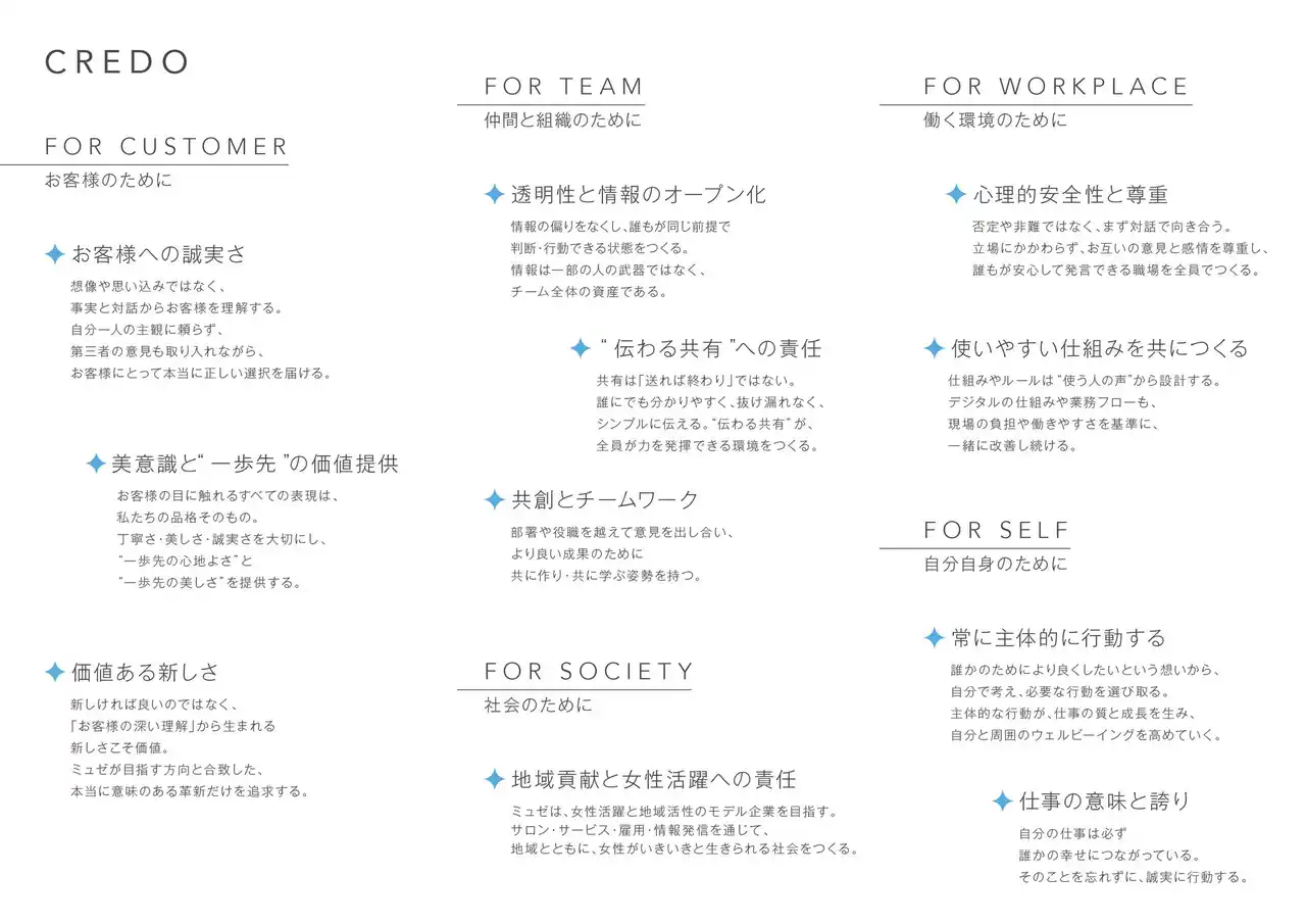 ・クレド:FOR CUSTOMER/TEAM/WORKPLACE/SELF/SOCIETY の5領域 |