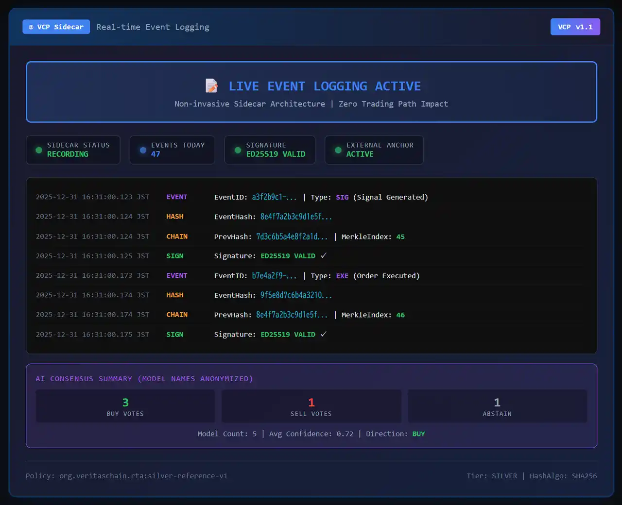VCP v1.1は、VCP v1.0との後方互換性を維持しながら、アルゴリズム取引およびAI駆動型取引システムにおける外部検証性と監査完全性を大幅に強化したプロトコルアップデートです。 |