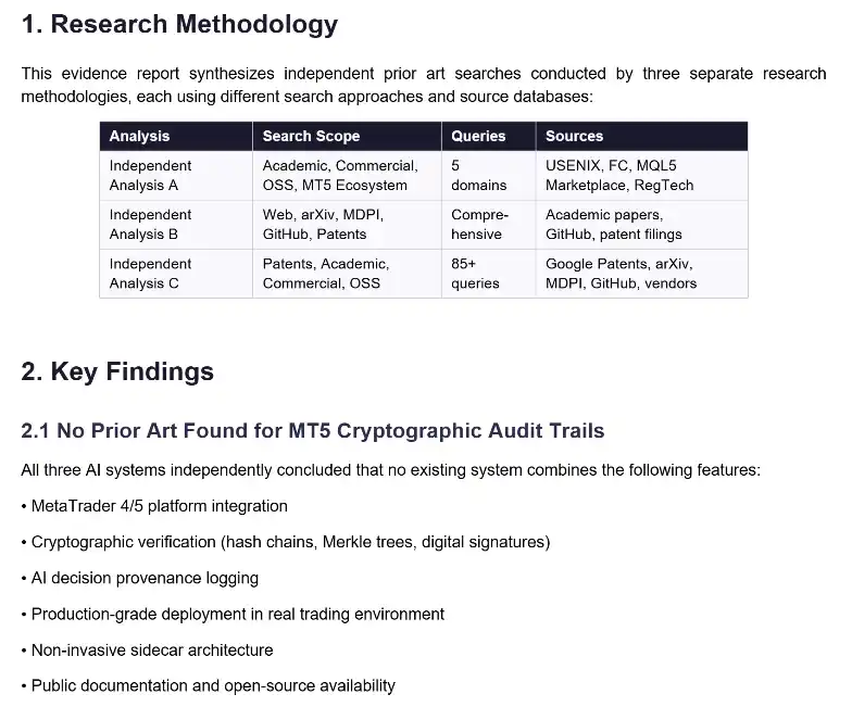 その結果、MT4/MT5対応、暗号学的検証、AI判断の記録、プロダクション水準の実装、非侵襲サイドカー構成を同時に満たす、公開済みの先行事例は確認されなかったという結論に至りました。 |