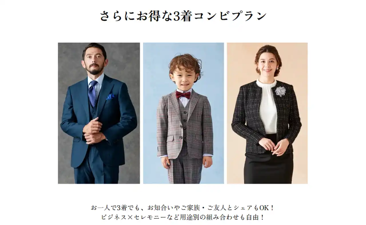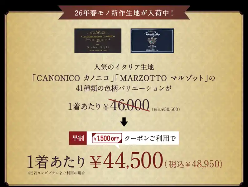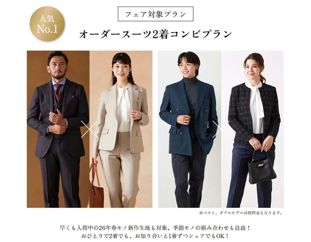 ※ コンビプラン・・・オーダースーツを2着以上ご購入していただいた場合の1着あたりのお値段です。組み合わせは自由ですので、異なる価格帯のオーダースーツと組み合わせていただいても本価格が適用されます。 |