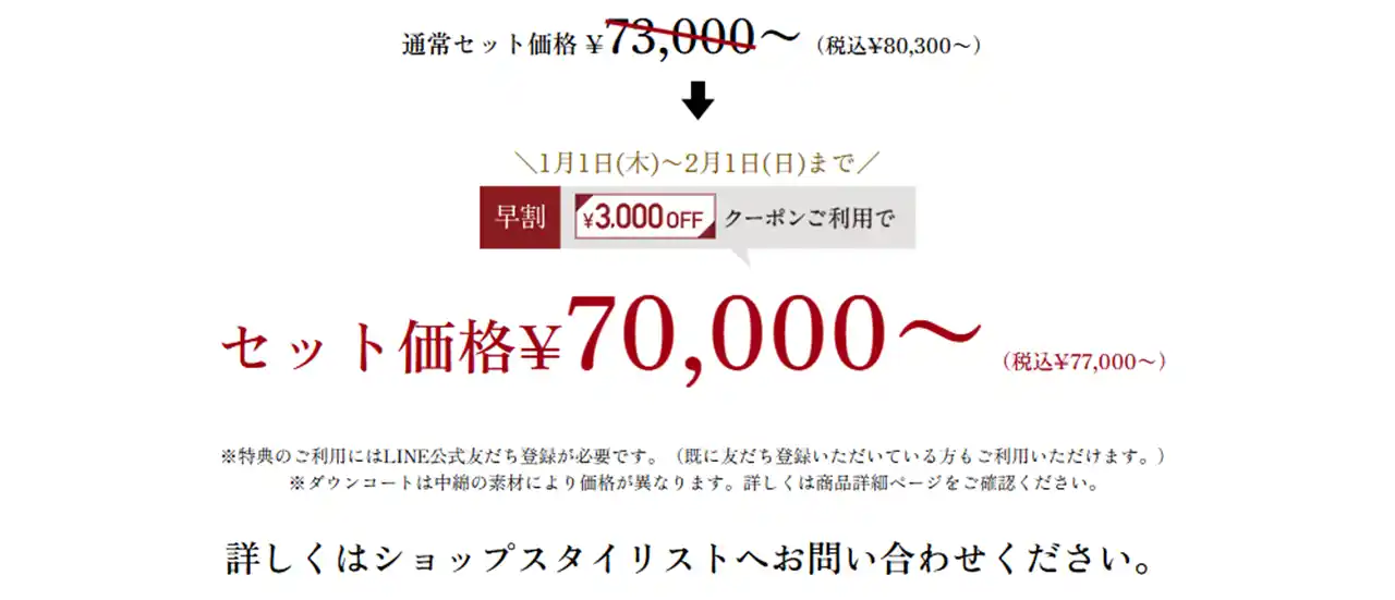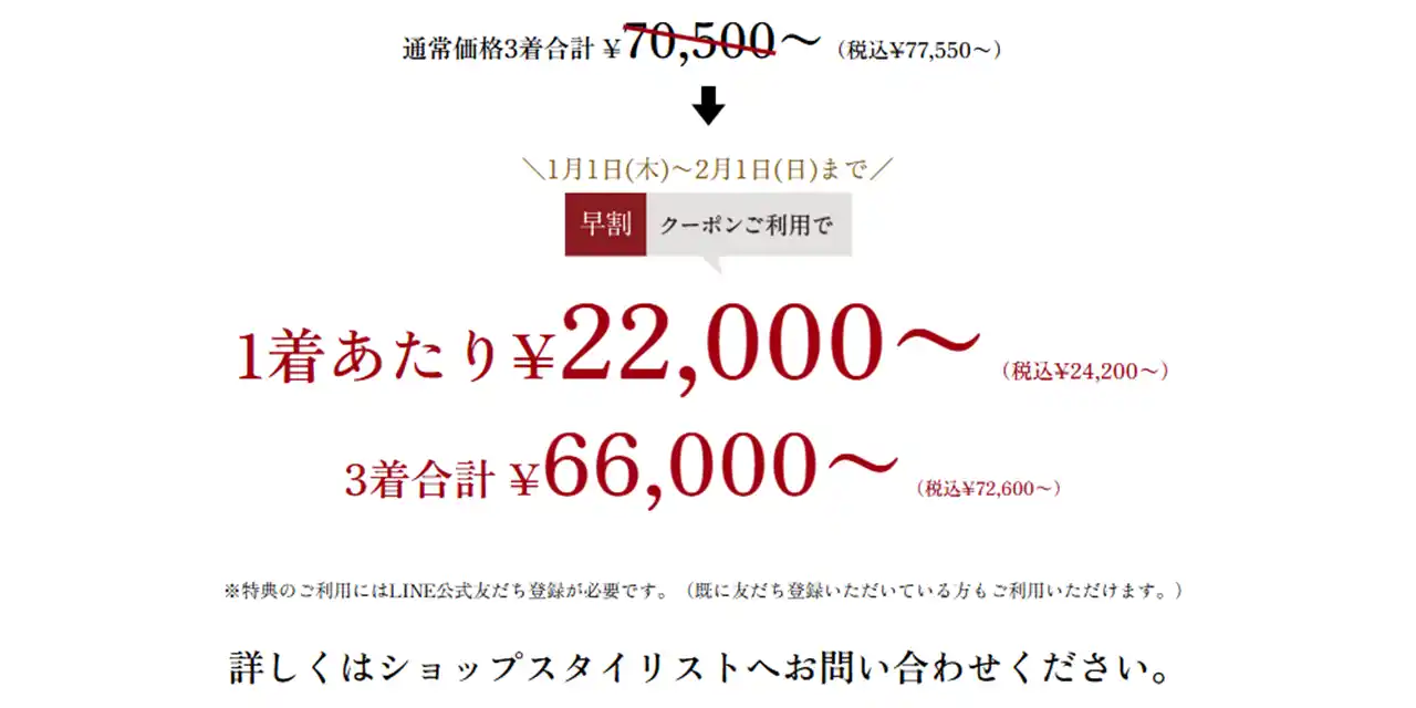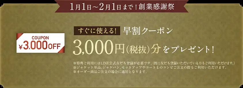 それに先駆け、皆様への感謝の気持ちを込めて『本格オーダースーツ3,000円OFFクーポン』をプレゼントする《創業98周年感謝祭》を開催いたします。クーポンのご利用で本格オーダースーツが1着あたり22,500円~(税込24,750円~)ご購入いただけます。《創業98周年感謝祭》は1月1日(木)から2月1日(日)までの期間限定、全店舗対象です。 |