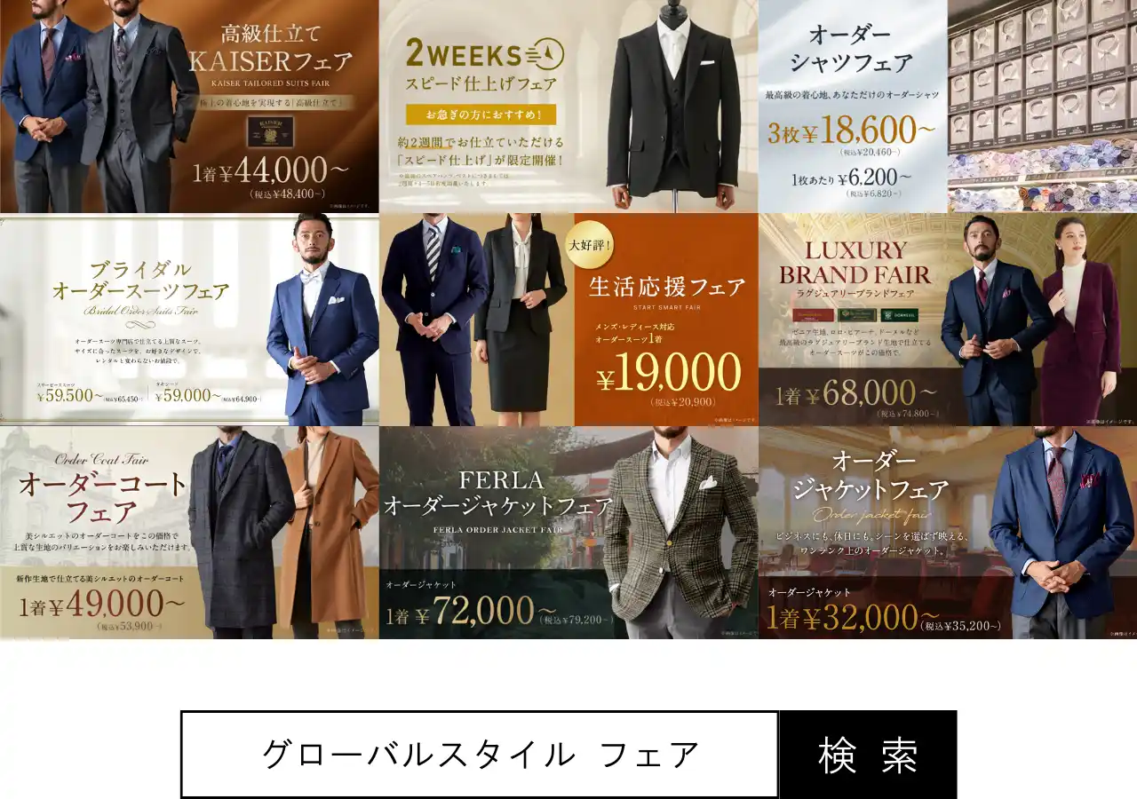 グローバルスタイルでは、全店舗で豪華なフェアを開催しております。最新のトレンドから定番アイテムまで、お得な情報が盛りだくさん。ぜひ「グローバルスタイル フェア」で検索して、自分に合ったフェアを見つけてみてください! |