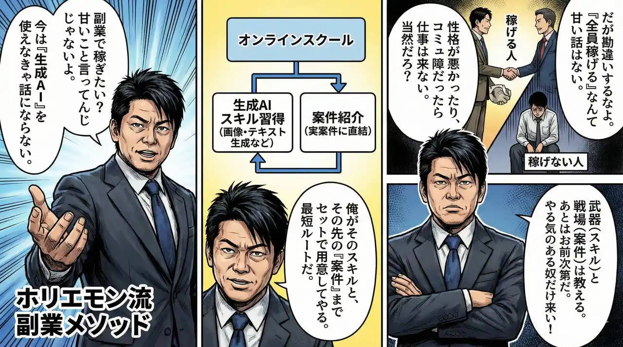 ホリエモンAI副業では、 この現実を前提に、営業活動に依存しない副業スタート設計を採用しています。 |