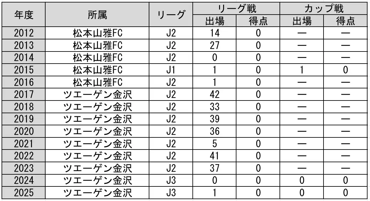 ■出場記録 J1リーグ 1試合(0得点) J2リーグ 275試合(0得点) J3リーグ 1試合(0得点) カップ戦 1試合(0得点) |