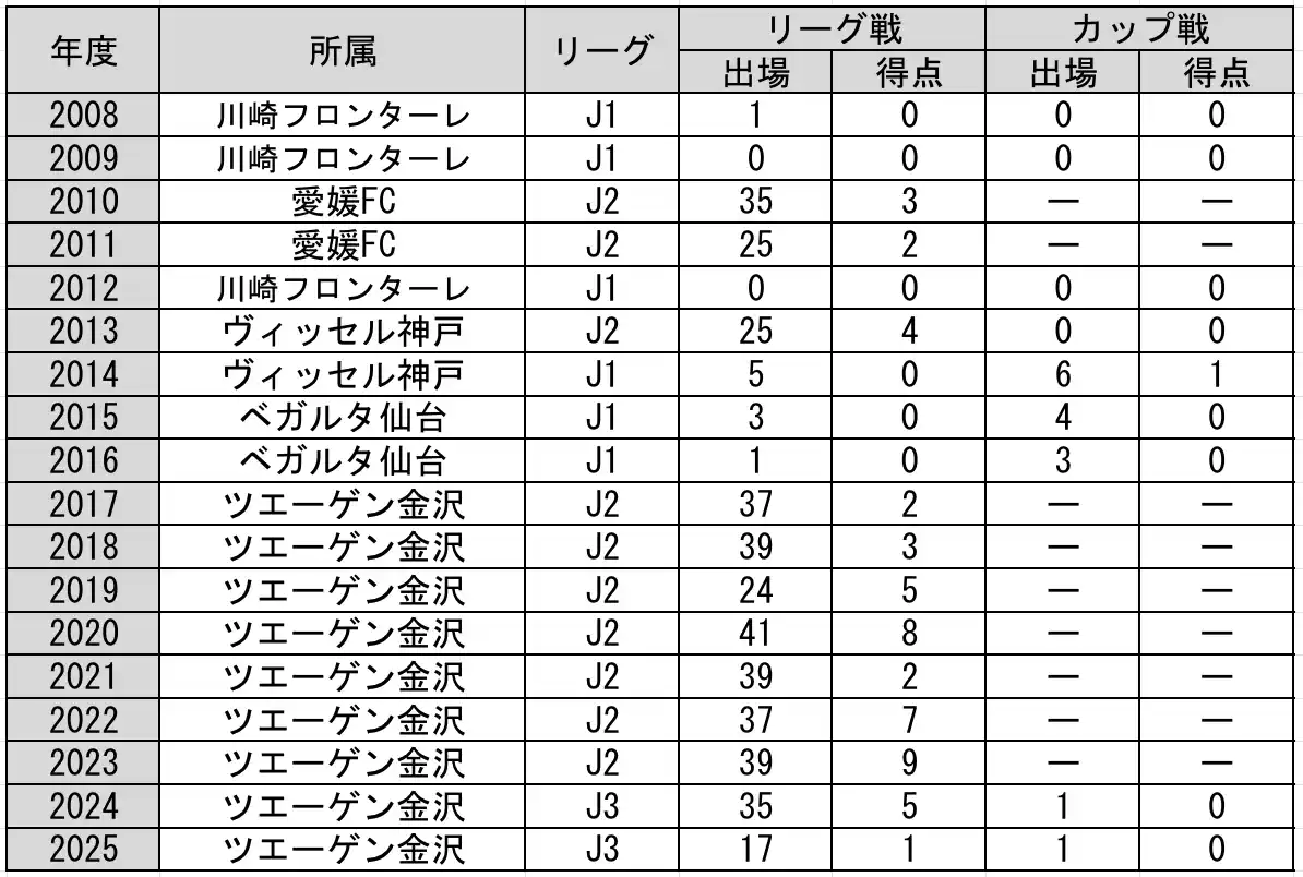 ◼️出場記録 J1リーグ 10試合(0得点) J2リーグ 341試合(45得点) J3リーグ 51試合(6得点) カップ戦 15試合(1得点) |