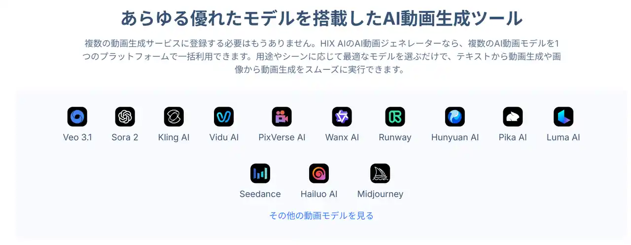 HIX AI は、業界最先端の生成AI動画モデルを一括して利用できます。これにより、多様なビジュアルスタイルや演出表現が可能になり、ユーザーはニーズに応じて最適なモデルを選択するか、AIが自動選定することで迷うことなく制作を開始できます。 |
