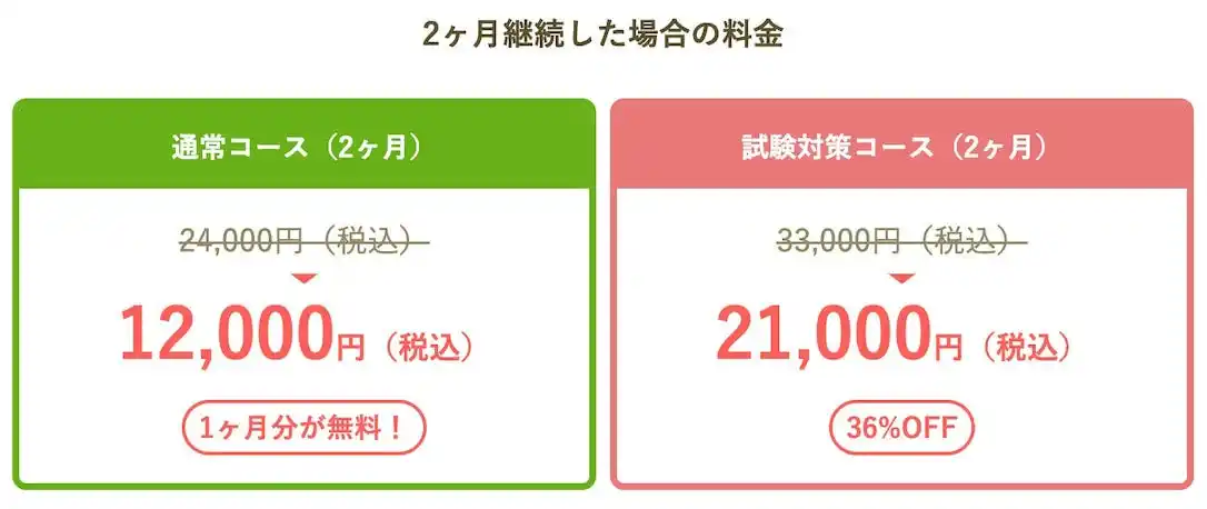 | 初月に続いて2ヶ月連続で受講いただいた方には、2ヶ月目の受講料(1ヶ月分)から7,000円をキャッシュバックします。 | ||||||||||