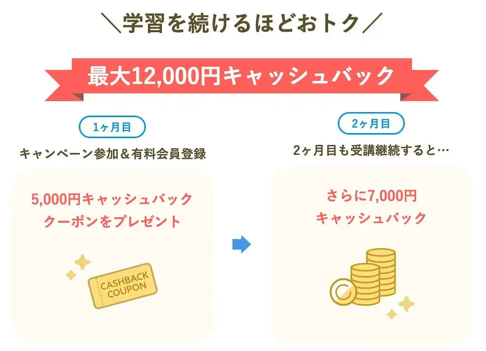 | さらに、2ヶ月目も受講を継続いただいた方には、2ヶ月目の受講料から7,000円をキャッシュバック。すべての条件を達成いただくことで、合計最大12,000円のキャッシュバックが受けられます。 | ||||||||||
