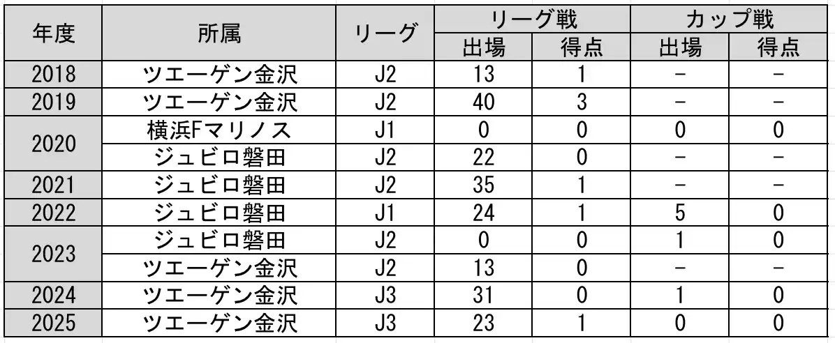 ◼️出場記録 J1リーグ 24試合(1得点) J2リーグ 123試合(5得点) J3リーグ 54試合(1得点) カップ戦 7試合(0得点) |