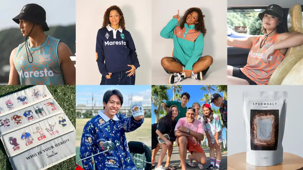 ラグビーアパレルからは岸本彩華選手が代表を務めるMaresta、垣永真之介選手が代表を務めるScrum Time、中島イシレリ選手が代表を務めるYeaboii、セルフケアブランドから尾崎晟也選手が代表を務めるSUIBASが出店します。 |
