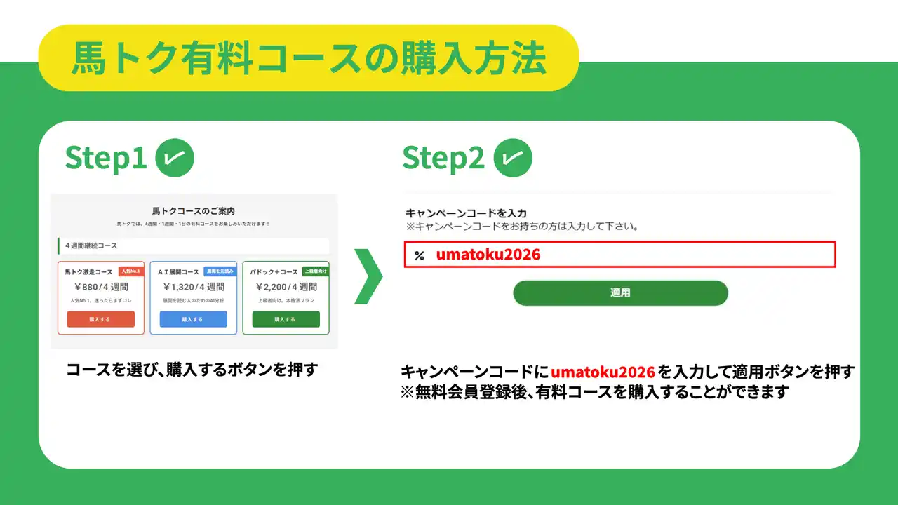 ・パドック+コース 2,200円/4週 開催1日あたり138円 ※開催1日あたりの金額は、本キャンペーンコードを適用した場合の金額です。 |