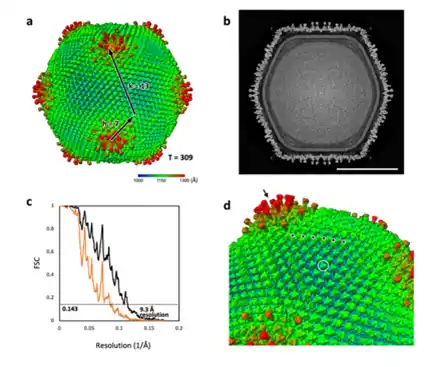 (a)ウシクウイルスの3D再構築像。解像度は9.3Å。正二十面体ウイルス粒子に十二カ所ある五回対称軸頂点周辺の大きなスパイク構造は、メドゥーサウイルスのそれに類似している。(b)ウシクウイルスのスライス画像。(c)再構築像の解像度を示すグラフ。(d)カプシド表面を覆うカプシドタンパク質最上部に特徴的なキャップ構造がみられる(○枠)。 |