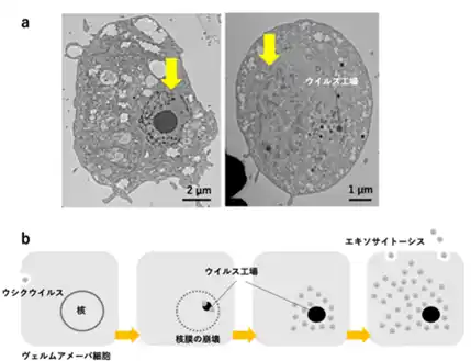 (a)正常のアメーバ細胞(左)では細胞核の核膜がよく見える(黄色い矢印)。これに対して、ウイルス感染アメーバ細胞(右)では核膜が見られない(黄色い矢印)。 |