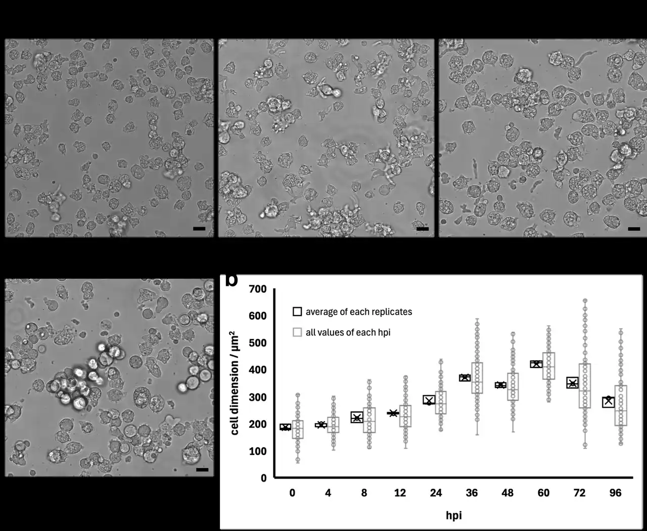 (a)顕微鏡観察の様子。感染後時間(hpi)を経るたびに細胞が肥大化していく。特に36時間後に最大となる。(b)細胞のサイズを計測して定量化したグラフ。 |
