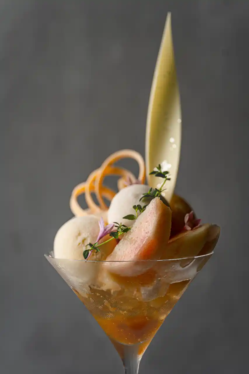 グラスのトップに大きめにカットした桃を贅沢に。桃アイスとグレープフルーツ&ライチのソルベがみずみずしい爽やかさを添え、バニラアイスとふんわり軽い桃のエスプーマがまろやかに包み込みます。さらに、ココナッツパウンドケーキやライム寒天、ミントゼリー、そして桃のコンフィチュールが層を成し、ひと口ごとに果実感と清涼感が広がる一品です。 |
