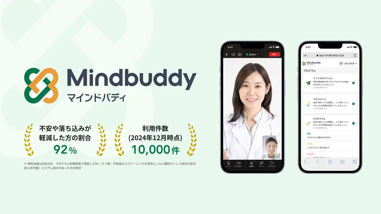マインドバディは、生涯で10人に1人がかかるとされるうつ病や不安症の改善・再発予防に有効な認知行動療法の普及を目指し、2023年11月からカウンセリングとアプリがセットになったオンライン定額制プログラムの提供を開始いたしました。 |