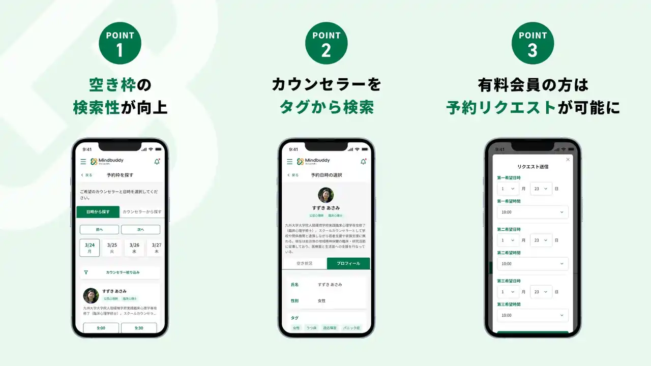 そこで、今回のリニューアルでは、カウンセラーや日時での検索性向上や有料会員の利便性向上を目的とした機能追加を行い、更に使いやすいメンタルケアサービスにリニューアルすることにいたしました。 |