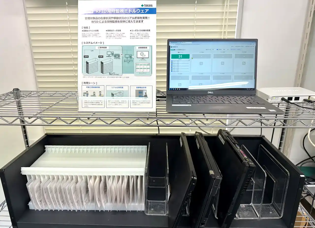 2025年7月にタカヤ株式会社東京支店のRFIDデモ用スペースをRFIDソリューションルームとしてリニューアルしました。当社のソリューションルームでは、RFID技術の可能性を実際に体感できる場として、製品やサービスのデモンストレーションをはじめ、具体的なアプリケーション例や導入事例を通じて、RFIDの活用方法を幅広くご紹介しています。事前予約いただければ、どなたでもご来場いただくことが可能です。当社のスタッフが丁寧にご説明いたしますので、初めての方でも安心してご利用いただけます。 |