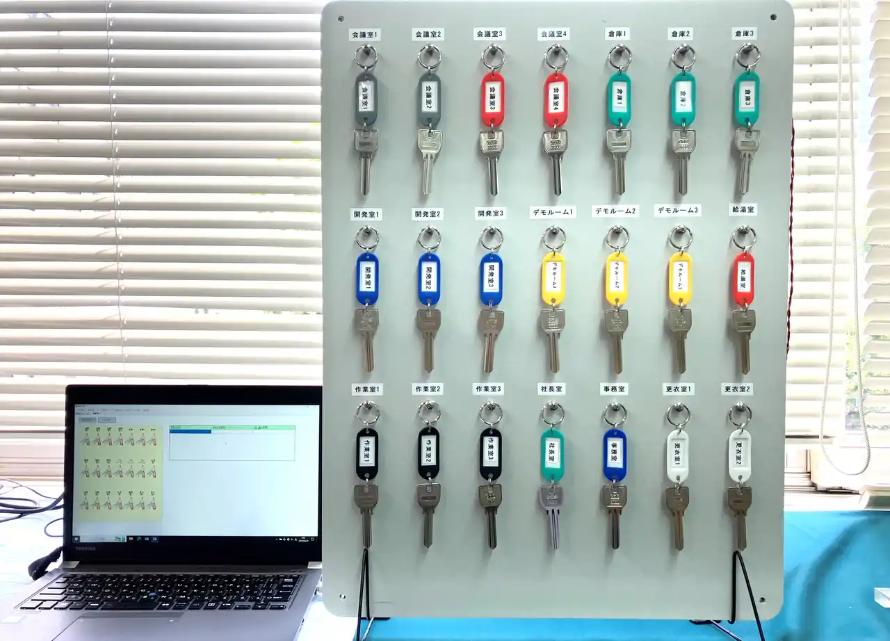 RFタグを鍵に取り付け、鍵管理ボードを設置するだけで、鍵の「持出時刻」「持出後の経過時間」を正確に記録可能。ボードタイプのため設置・移動などレイアウト変更もらくらくで、現状の運用そのままにRFIDでかんたん鍵管理が実現できます。 |