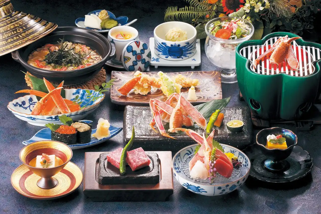 お品書き ◇小鉢 ◇ずわいかに酢 ◇ずわいがにと季節のお造り ◇かにしゅうまい ◇茶碗蒸し ◇にぎり寿司(いくら・かにみそ) ◇かにサラダ ◇黒毛和牛の溶岩焼 ◇ずわいがにの七輪焼 ◇ずわいがにの天婦羅 ◇かに雑炊 ◇香の物 ◇デザート |