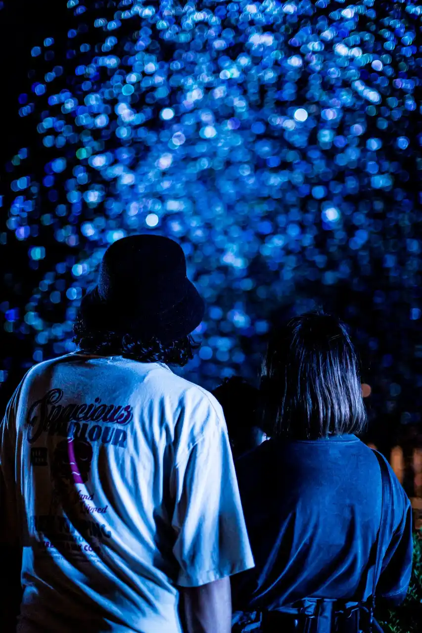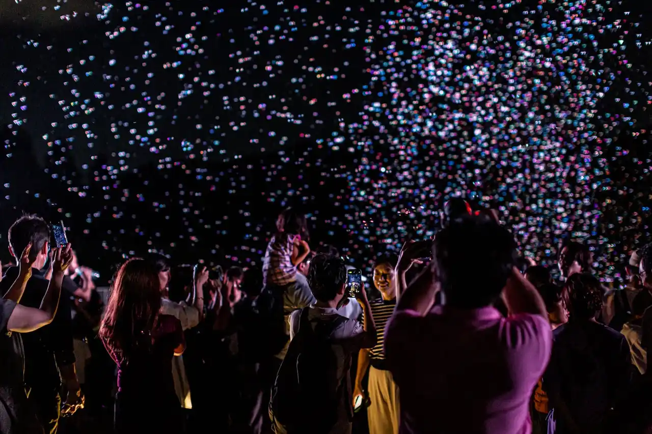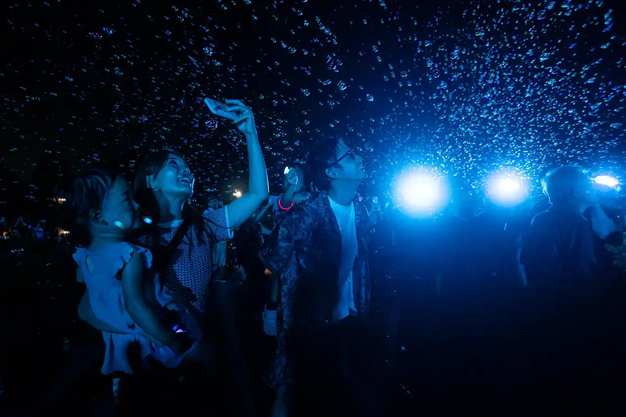 「バブルミネーション」はOUTDOOR THEATER JAPANが提供する夜空を劇場化するプロジェクト。自然に還るサスティナブルなシャボン⽟を夜空に舞い上げ、光り輝く空間を作り上げる体験イベントです。 |